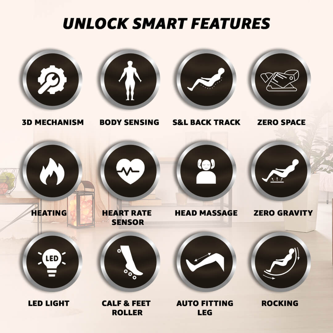 - Massage Modes: Heat, Massage, Music, Health Test, USB Charger, Voice Control