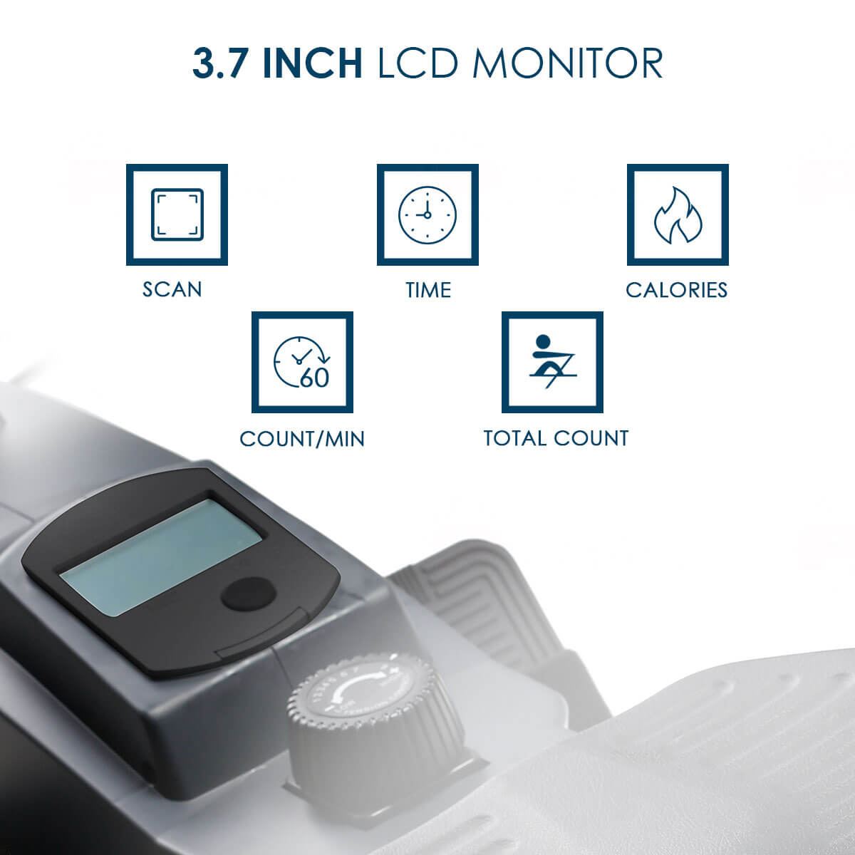 - Display: 3.7 inch LCD Monitor – Total Count, Calories, Count/Min, Count, Scan, Time