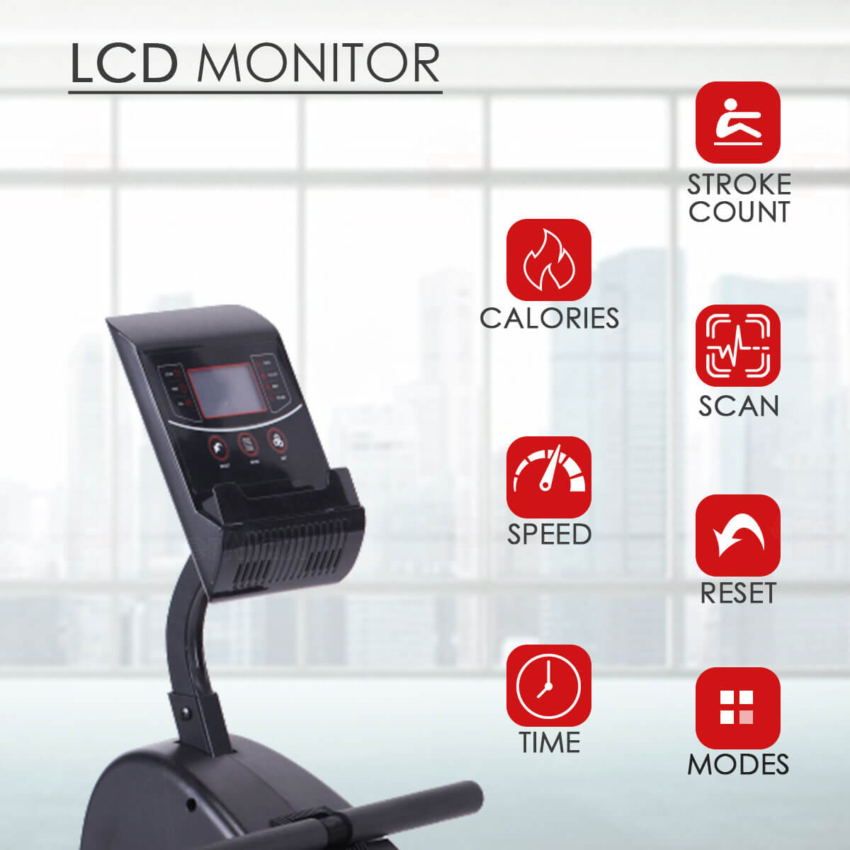- Display: LCD Monitor – Scan, Stroke Count, Time, Calories, Speed, Reset